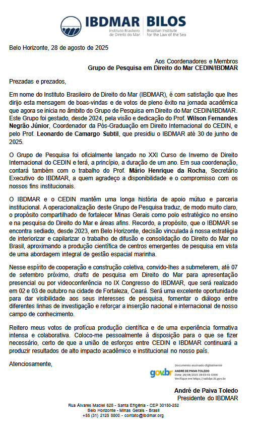 Por meio de carta datada de 28 de agosto de 2025, a Presidência do IBDMAR convidou formalmente o Grupo de Pesquisa a submeter drafts para o IX Congresso do IBDMAR, que ocorrerá nos dias 02 e 03 de outubro, em Fortaleza/CE.
